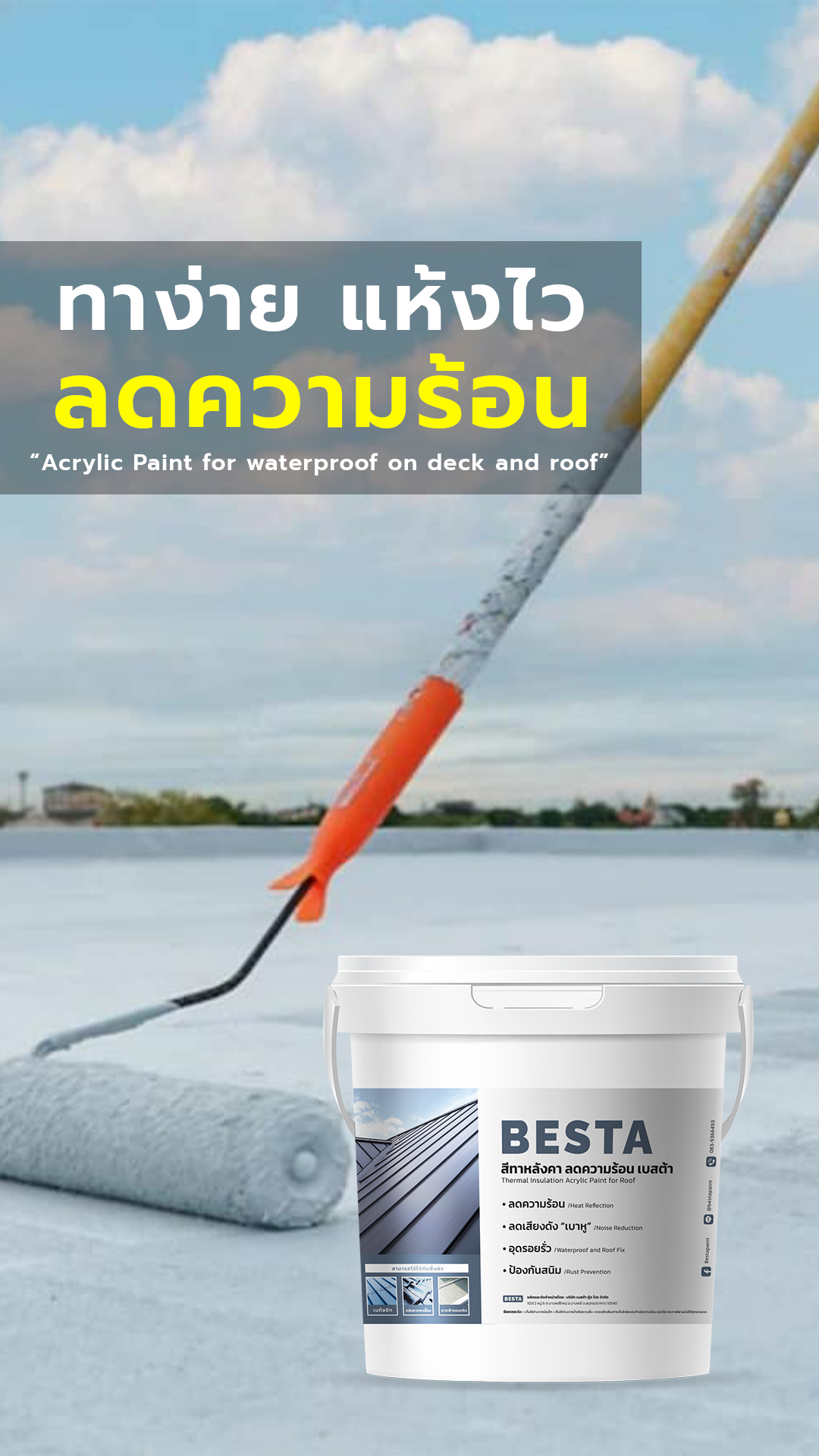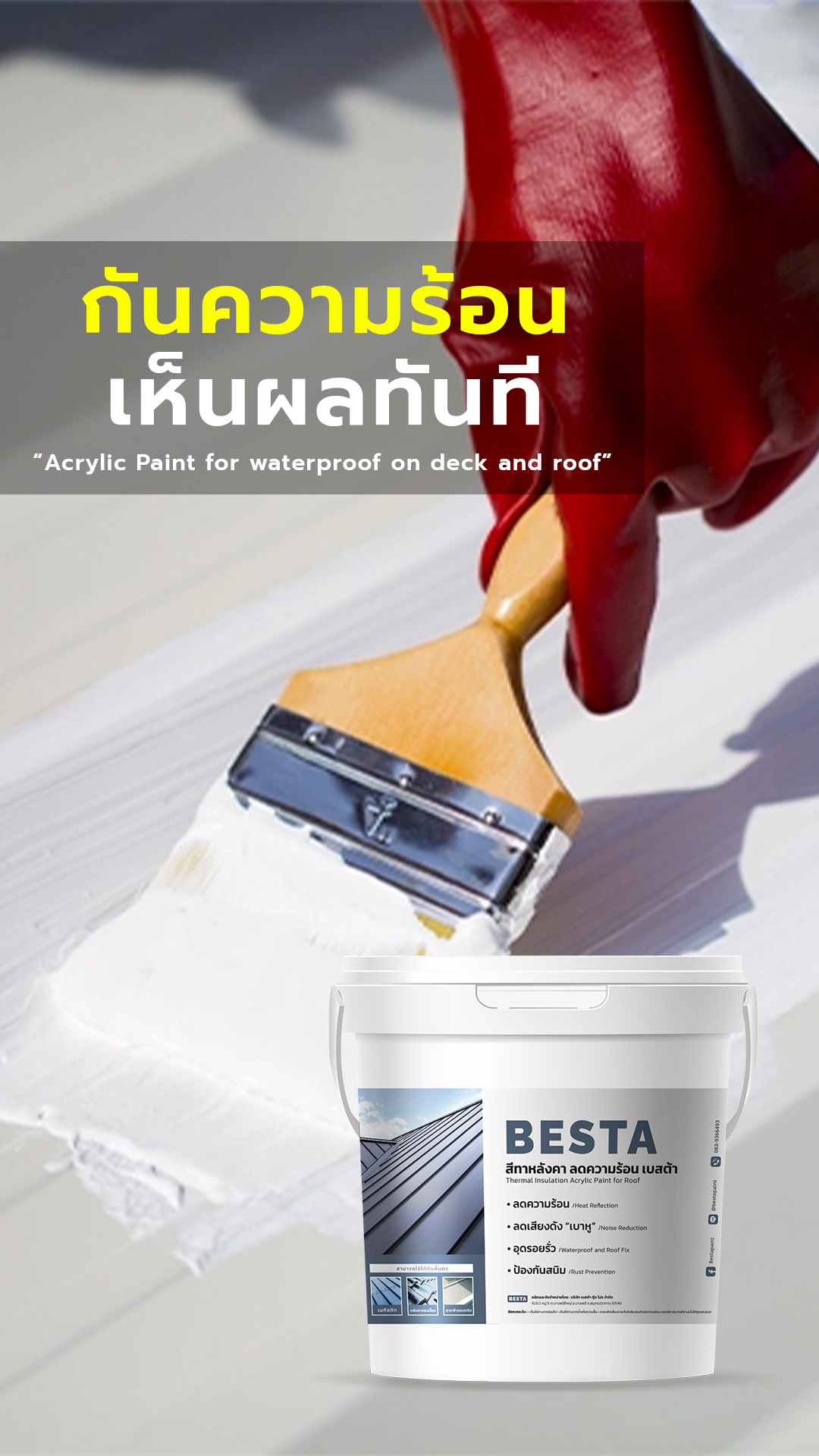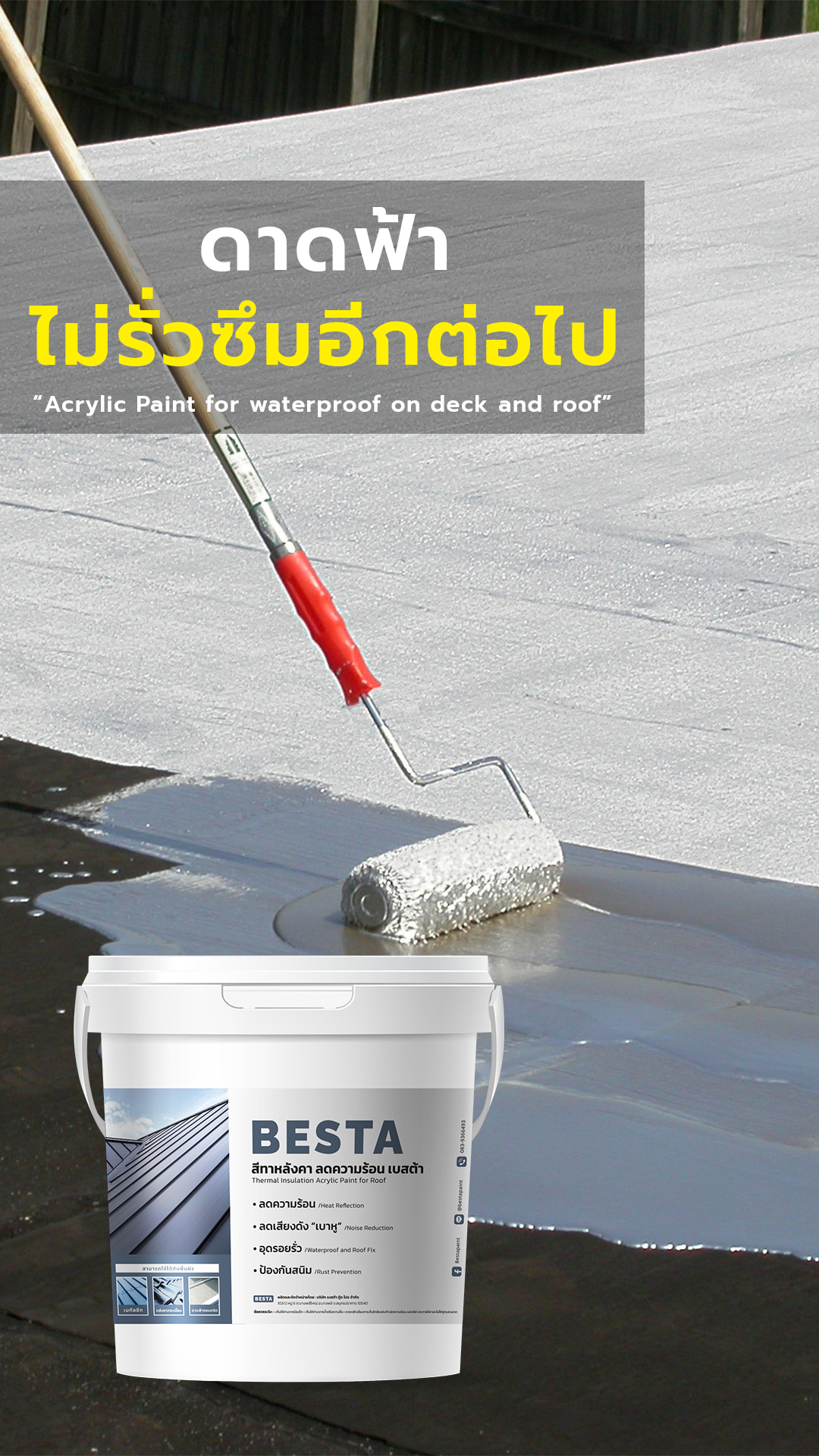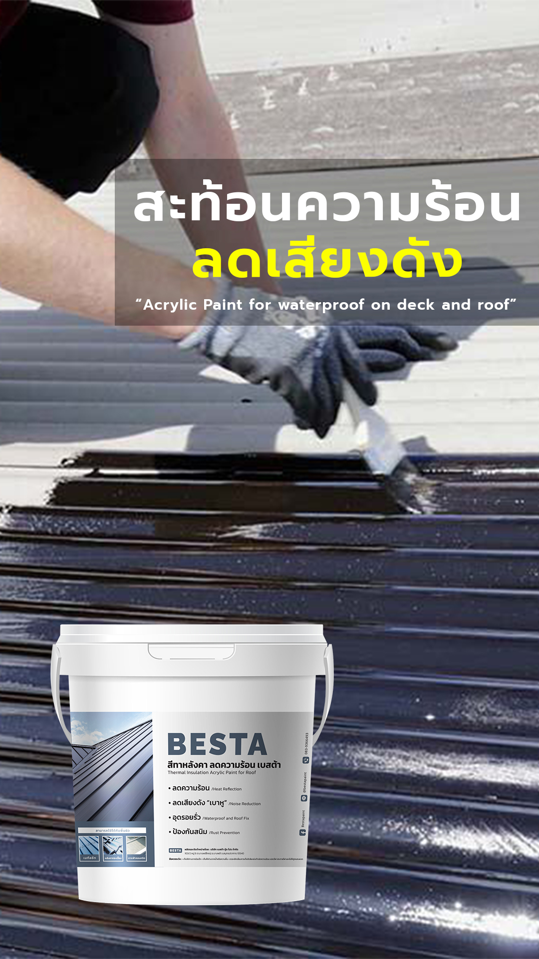 ครบจบทุกปัญหา สีอะคริลิกสูตรน้ำ นวัตกรรมใหม่ที่จะช่วยแก้ปัญหาหลังคาบ้านอย่างง่ายดาย ลดร้อน ลดเสียง ลดรอยรั่วซึม ใช้เพื่อทาหลังคาบ้าน หลังคาส่วนต่อเติม หลังคาโรงจอดรถ อาคารเชิงพาณิชย์ เช่น ร้านอาหาร โรงเรือนการเกษตร โรงงานอุตสาหกรรม โกดัง ฯลฯ