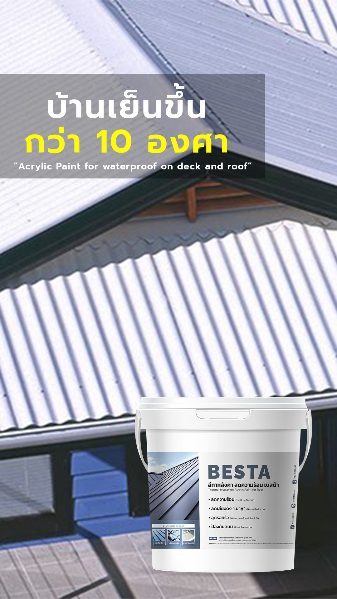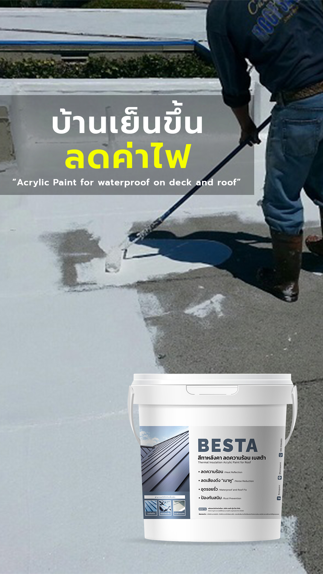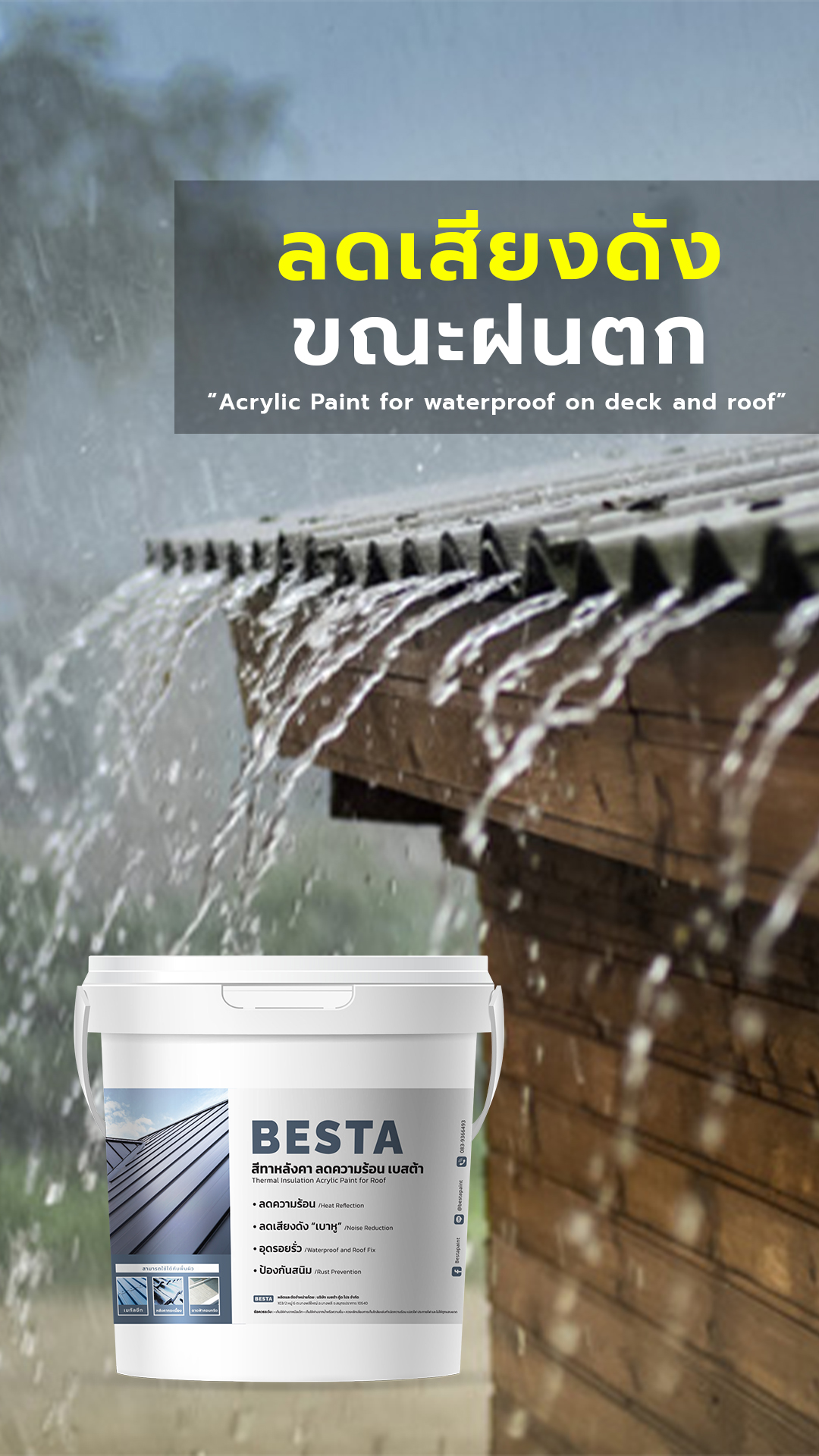 ครบจบทุกปัญหา สีอะคริลิกสูตรน้ำ นวัตกรรมใหม่ที่จะช่วยแก้ปัญหาหลังคาบ้านอย่างง่ายดาย ลดร้อน ลดเสียง ลดรอยรั่วซึม ใช้เพื่อทาหลังคาบ้าน หลังคาส่วนต่อเติม หลังคาโรงจอดรถ อาคารเชิงพาณิชย์ เช่น ร้านอาหาร โรงเรือนการเกษตร โรงงานอุตสาหกรรม โกดัง ฯลฯ