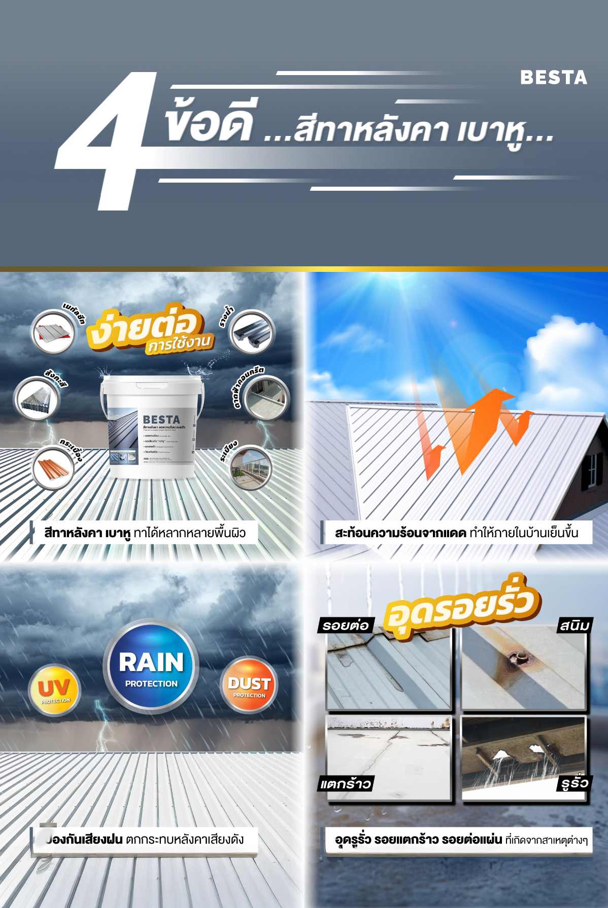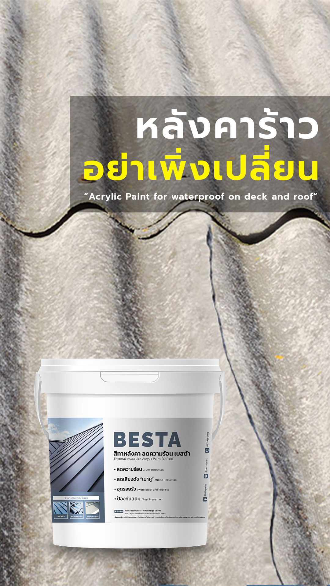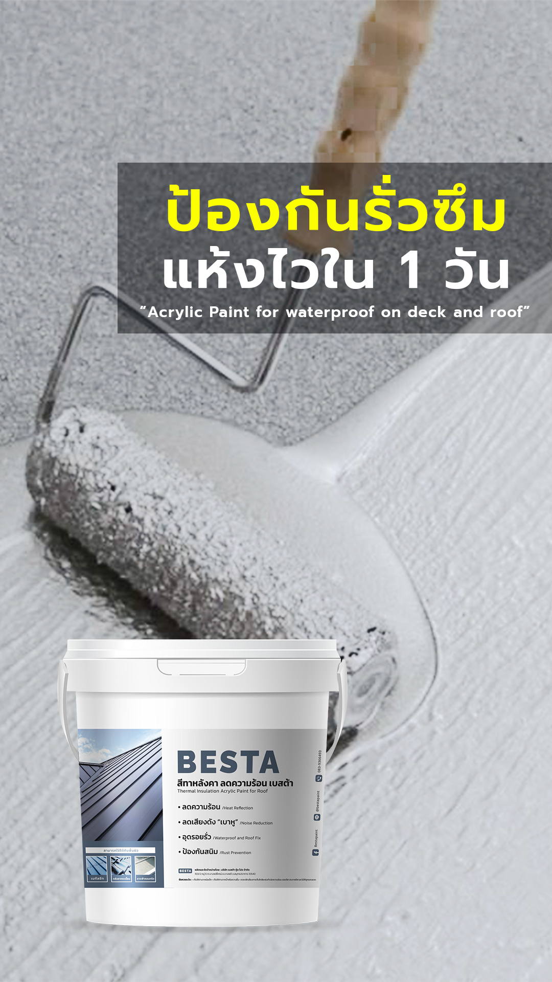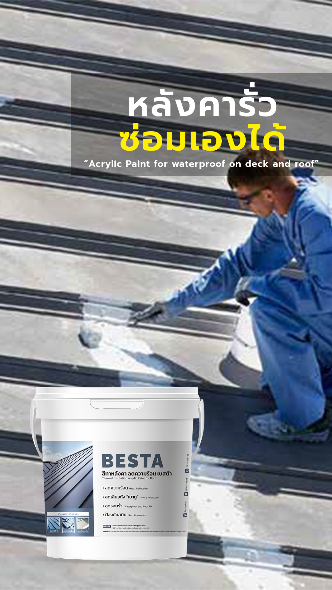 ครบจบทุกปัญหา สีอะคริลิกสูตรน้ำ นวัตกรรมใหม่ที่จะช่วยแก้ปัญหาหลังคาบ้านอย่างง่ายดาย ลดร้อน ลดเสียง ลดรอยรั่วซึม ใช้เพื่อทาหลังคาบ้าน หลังคาส่วนต่อเติม หลังคาโรงจอดรถ อาคารเชิงพาณิชย์ เช่น ร้านอาหาร โรงเรือนการเกษตร โรงงานอุตสาหกรรม โกดัง ฯลฯ