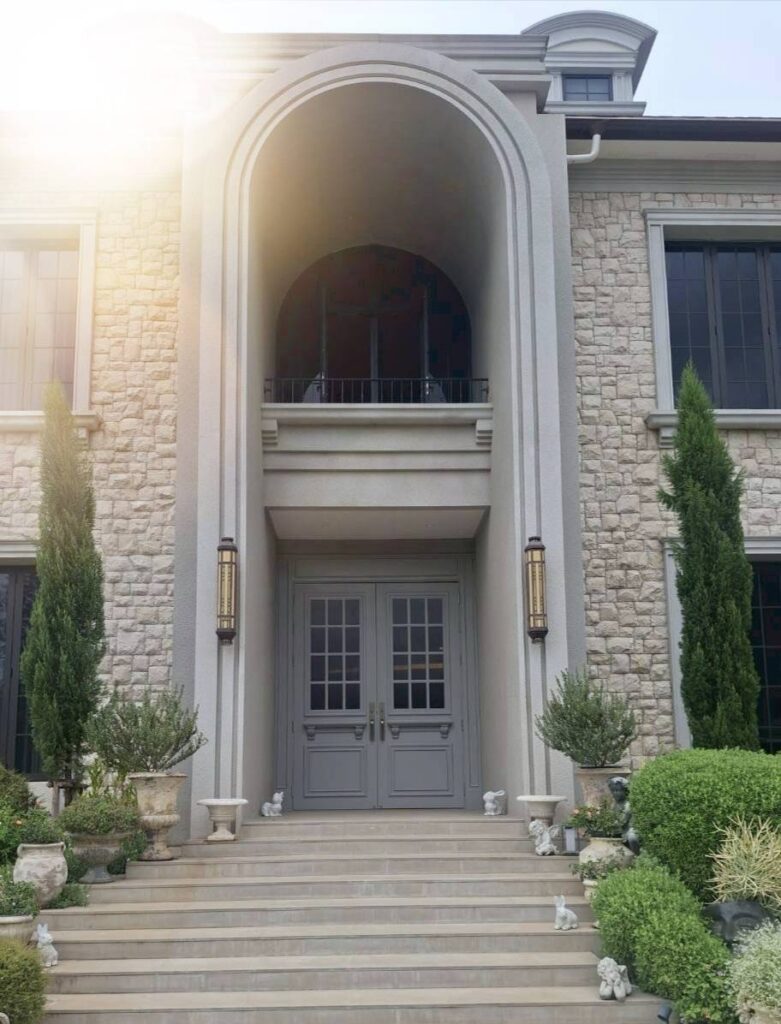 ประตูบานคู่สีเทานี้คือหัวใจของทางเข้าหลักที่สะท้อนความสง่างามเหนือกาลเวลา ด้วยดีไซน์คลาสสิคที่ผสานความทันสมัยอย่างกลมกลืน รายละเอียดของบานประตูแบ่งช่องกระจกสี่เหลี่ยมช่วยเพิ่มความโปร่งโล่ง ขณะเดียวกันยังคงให้ความเป็นส่วนตัว โครงประตูออกแบบในสัดส่วนที่พอดี และตกแต่งด้วยมือจับคู่ที่ดูเรียบหรู ตัวประตูถูกจัดวางอย่างเหมาะสมในช่องโค้งสูงซึ่งเป็นเอกลักษณ์ของสถาปัตยกรรมแบบยุโรปเพิ่มมิติความโอ่อ่า ให้แก่ตัวบ้าน และสร้างความประทับใจทันทีที่เดินเข้ามาถึง
