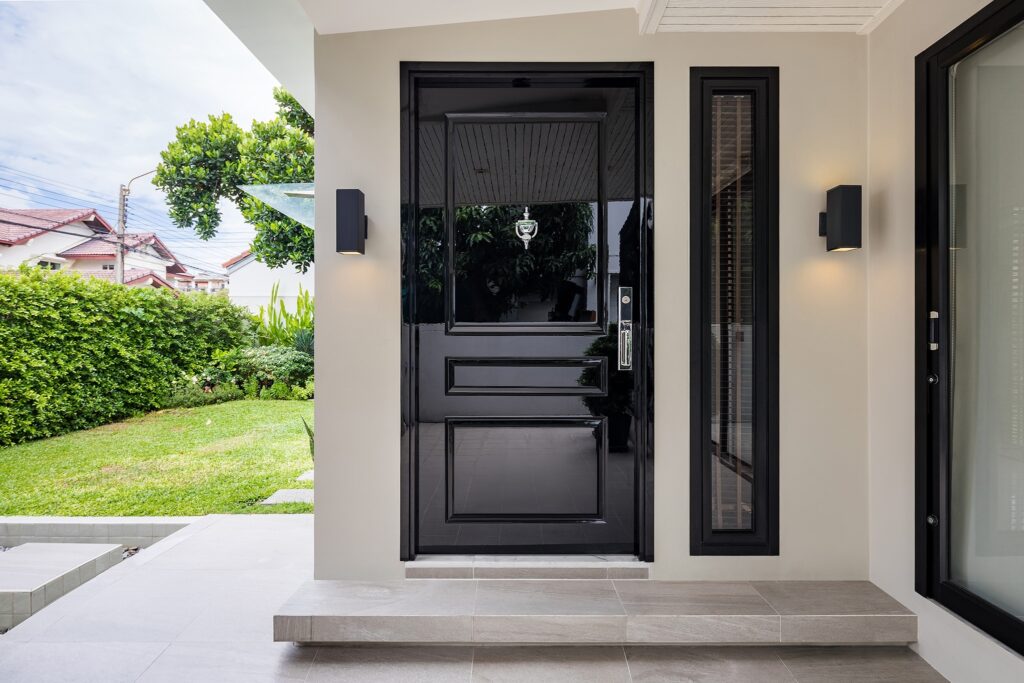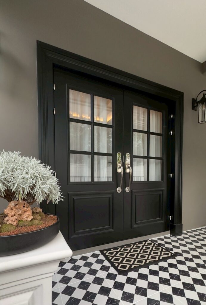 ทำให้ทางเข้าบ้านที่ดูเรียบหรู โดดเด่นด้วยสีดำเงางามที่ให้ความรู้สึกมีระดับและสง่างาม ตัดกับผนังสีครีมอ่อนที่ช่วยขับให้ประตูดูโดดเด่นมากยิ่งขึ้น ผิวประตูมีความเรียบเนียนและความเงาที่สะท้อนแสงได้สวยงาม สีดำนี้ช่วยสร้างความโดดเด่นและความเป็นทางการให้กับบ้าน ประตูบานนี้เหมาะสำหรับบ้านสไตล์คลาสสิก หรือแม้กระทั่งโมเดิร์นที่ต้องการความหรูหรา เป็นตัวเลือกที่ดีสำหรับผู้ที่ต้องการประตูที่สวยงาม ใช้งานได้จริง และสร้างความประทับใจแรกพบที่ดีให้กับแขกผู้มาเยือน