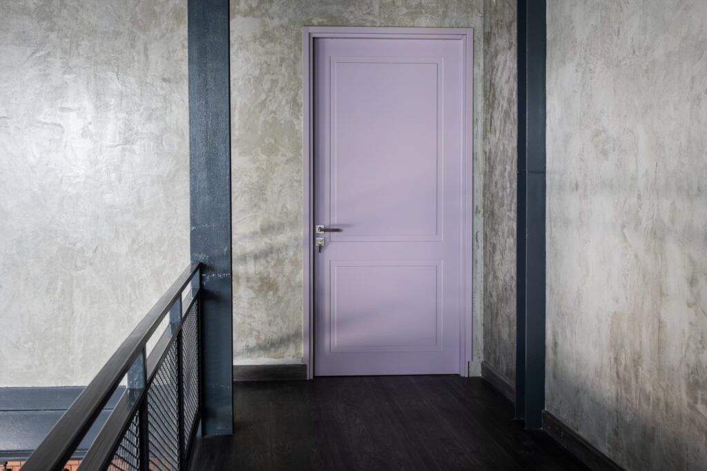 เป็นความอ่อนหวานที่ให้ความรู้สึกผ่อนคลายและมีสไตล์ไม่ซ้ำใคร สีม่วงที่เลือกใช้เป็นโทนที่ไม่ฉูดฉาด แต่กลับดูมีเสน่ห์และทันสมัยอย่างยิ่ง การออกแบบบานประตูแบ่งเป็นแผงลูกฟักสองส่วนที่เรียบง่ายแต่เพิ่มมิติให้กับตัวบานประตูอย่างลงตัว มือจับประตูดีไซน์ทันสมัยสีโครเมียมด้าน หรือ สเตนเลสสตีล ให้ความรู้สึกแข็งแรงทนทานและใช้งานง่าย ผนังสไตล์ลอฟท์ช่วยขับเน้นสีม่วงของประตูให้โดดเด่นขึ้นมาอย่างชัดเจน เหมาะสำหรับเจ้าของบ้านที่มีสไตล์ บ่งบอกถึงความเป็นตัวเองได้อย่างลงตัว