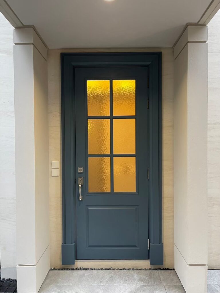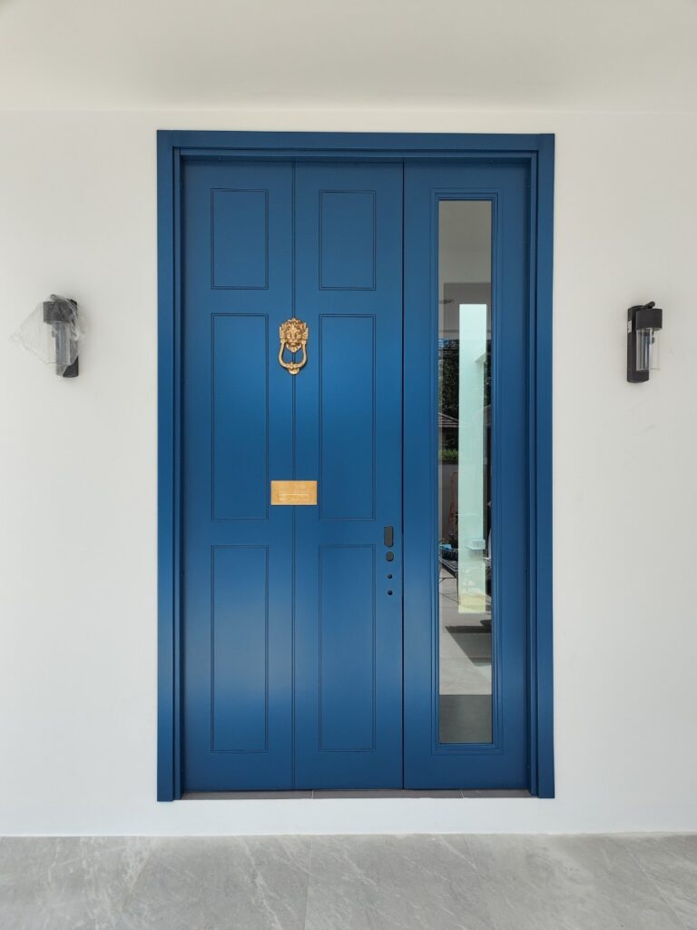 ประตูบานนี้โดดเด่นด้วยดีไซน์โมเดิร์นคลาสสิก สีน้ำเงินที่ให้ความรู้สึกหรูหราและทันสมัยในเวลาเดียวกัน ตัวบานประตูออกแบบแบบกรอบลูกฟัก ให้ความรู้สึกแข็งแรง สง่างาม พร้อมลูกเล่นที่เคาะประตูลายหัวสิงโตสีทอง เพิ่มความมีระดับและสไตล์อังกฤษเข้าไปอีกขั้น ติดตั้งคู่กับบาน Fixed กระจกใสขนาดเต็มบานด้านข้าง ช่วยให้แสงธรรมชาติส่องเข้าได้อย่างพอเหมาะ เหมาะสำหรับบ้านที่ต้องการความโดดเด่นตั้งแต่ทางเข้า ให้ความรู้สึกภูมิฐาน ทันสมัย และต้อนรับได้อย่างอบอุ่นทุกครั้งที่กลับถึงบ้าน