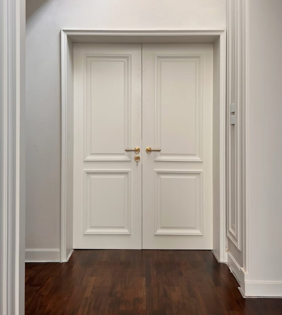 ประตูบานคู่ สะท้อนความหรูหราอย่างมีระดับด้วยดีไซน์คลาสสิกที่เรียบง่ายแต่เปี่ยมด้วยรายละเอียด โทนสีขาวนวลช่วยขับให้บรรยากาศดูอบอุ่น สะอาดตา และทันสมัยในเวลาเดียวกัน ประตูออกแบบอย่างประณีต เพิ่มมิติให้ดูโดดเด่นอย่างมีศิลปะ จับคู่กับมือจับทองแบบก้านโยกที่เติมกลิ่นอายความพรีเมียมได้อย่างลงตัว เหมาะสำหรับบ้านหรือโครงการ ที่ต้องการสื่อถึงความพิถีพิถัน รสนิยม และความภูมิฐานในทุกรายละเอียด เพราะประตูไม่ใช่แค่ทางผ่าน แต่คืองานศิลป์ที่ยกระดับทุกมุมมองของพื้นที่ภายในบ้าน