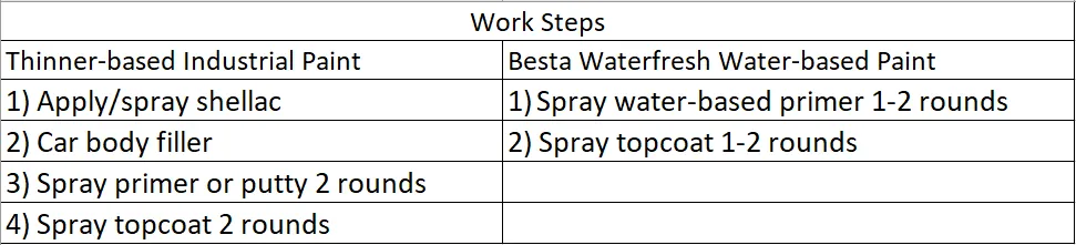 This doesn’t include surface preparation by sanding between each coat. Reducing paint steps also reduces sanding time and labor costs. Each coat of water-based paint dries in about 20-30 minutes.